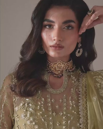 Elevate your wardrobe with this exquisite piece, featuring stunning hand-embellished embroidered organza panels on the front and sleeves and an intricately embroidered organza back. Complemented by raw silk sharara, this mint green top is truly a work of art. And with the addition of a delicate embroidered net dupatta, you'll feel like you're wearing a masterpiece.