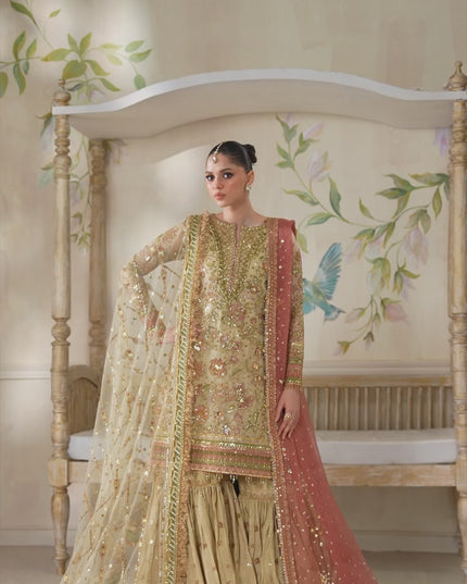 Handcrafted dabka and floral sequins enhance the embroidered details, complemented by delicate sequin scatter on the dupatta for an ethereal finish.