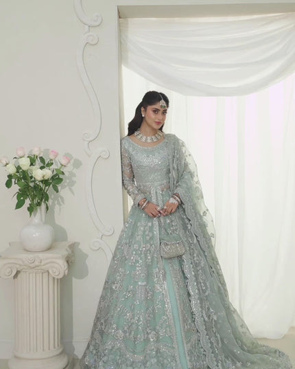 By Faiza Saqlain—a masterpiece of refined sophistication in soft mint green. This exquisite three-piece ensemble features a sheer organza maxi gown with front panels lavishly embellished and embroidered across the bodice, panels, sleeves, and hemline, creating an intricate tapestry of heritage craftsmanship. The coordinating raw silk lehenga showcases detailed embroidered borders, while the organza dupatta completes the look with ornate center and pallu embroidery. Every element—from the embroidered belt to the delicate back neck detailing—speaks to timeless elegance and meticulous artistry. Finished with luxurious silk lining, this ensemble promises to make you radiate grace and confidence at weddings, celebrations, and milestone moments.