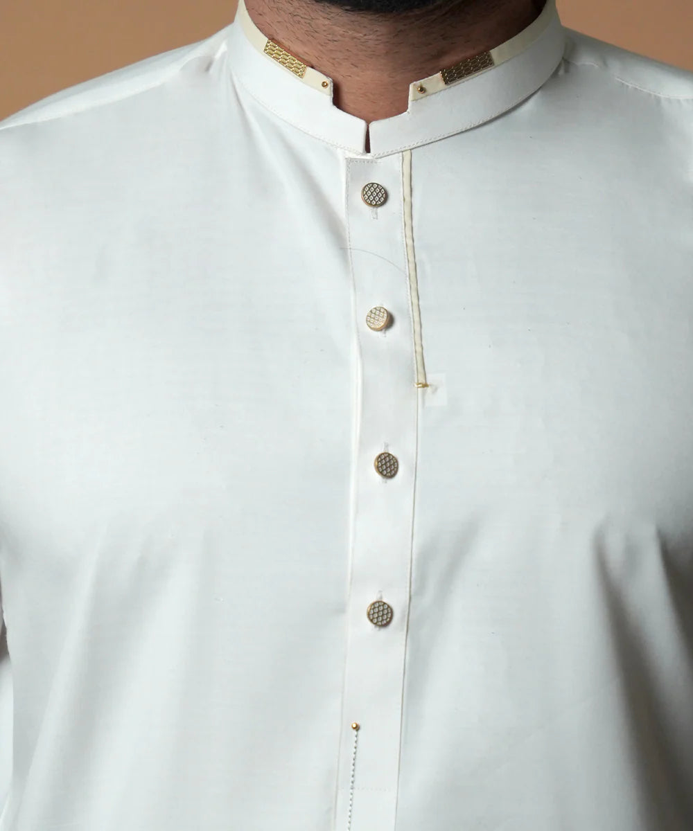 Discover refined elegance with the Ivory Shalwaar Kameez, a masterpiece that seamlessly fuses heritage with contemporary design. Tailored from self-textured non-iron fabric, this ensemble resists wrinkles while maintaining breathability for all-day comfort. The pristine ivory tone is elevated by signature premium gold buttons that add a regal flourish, creating an outfit of understated luxury.