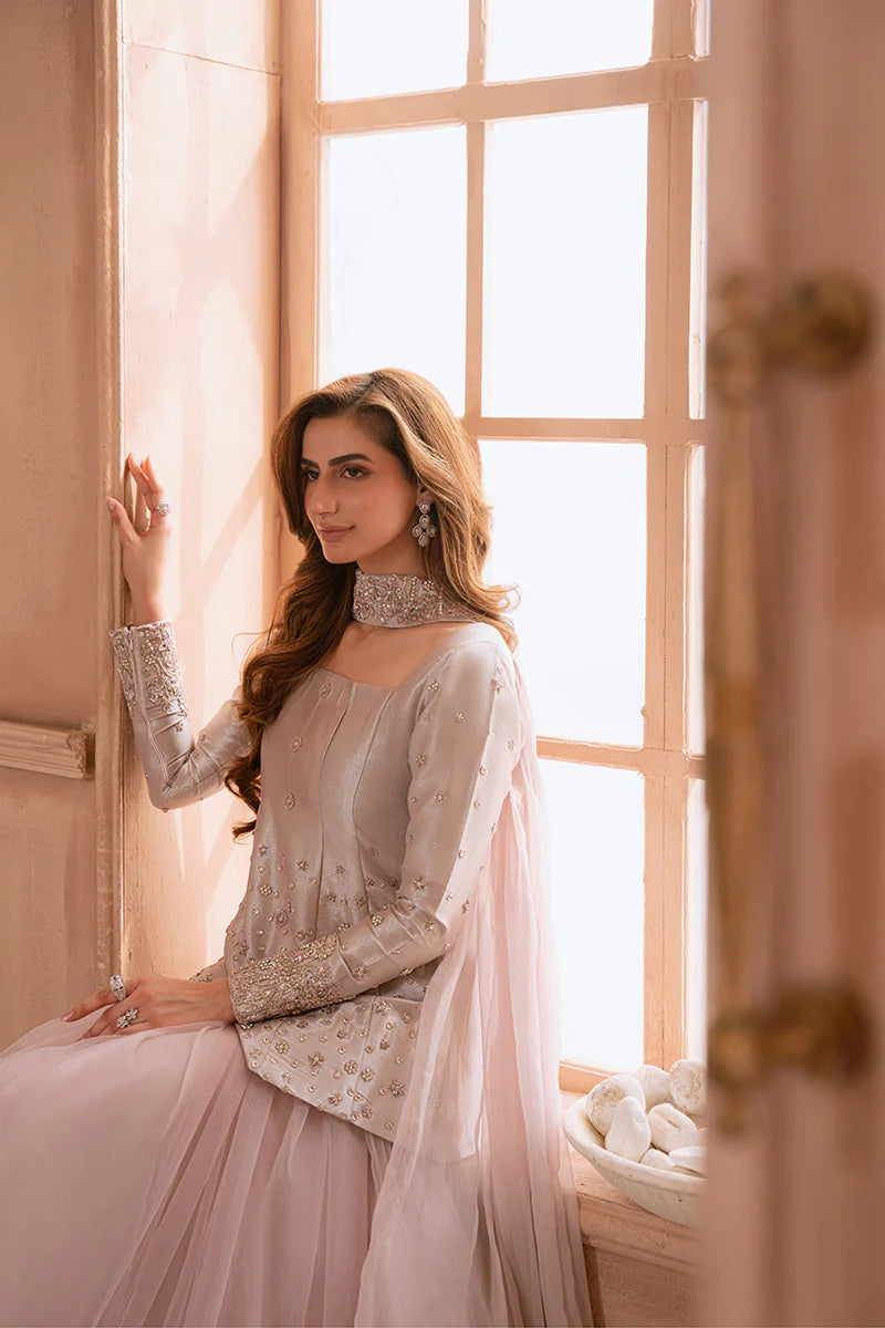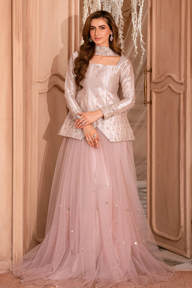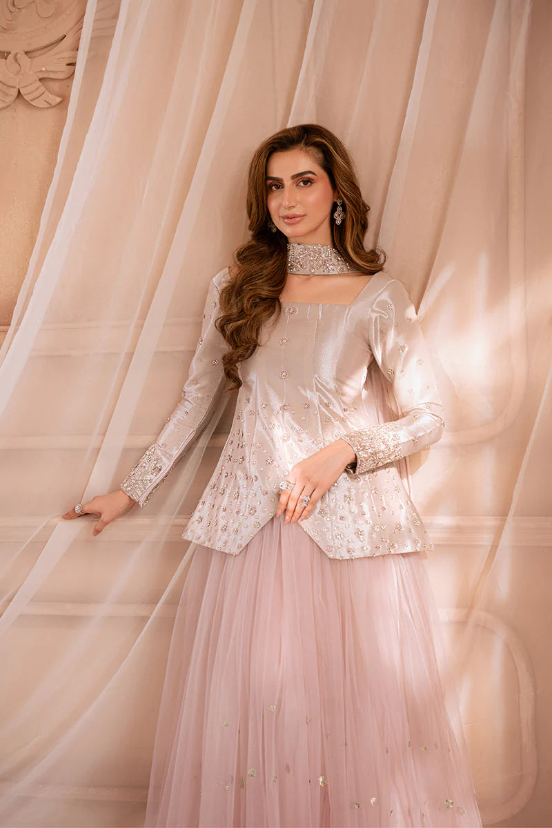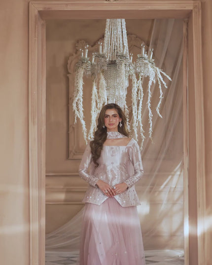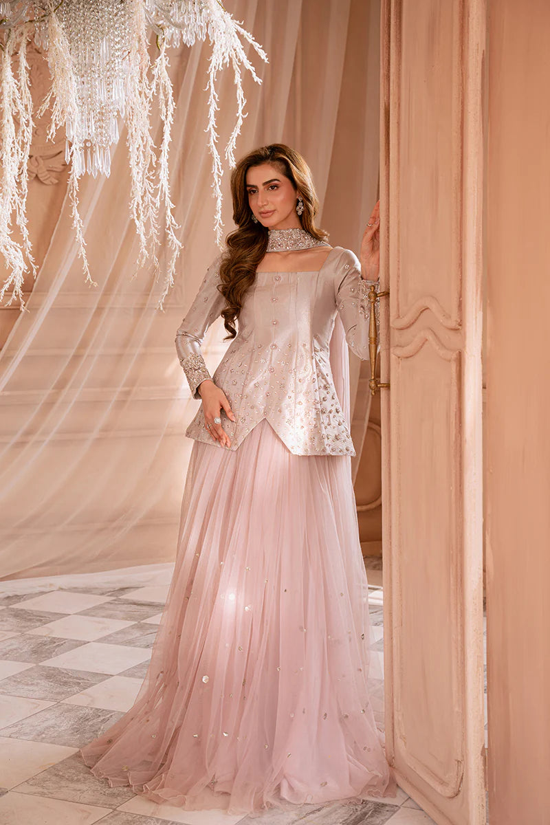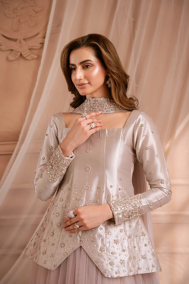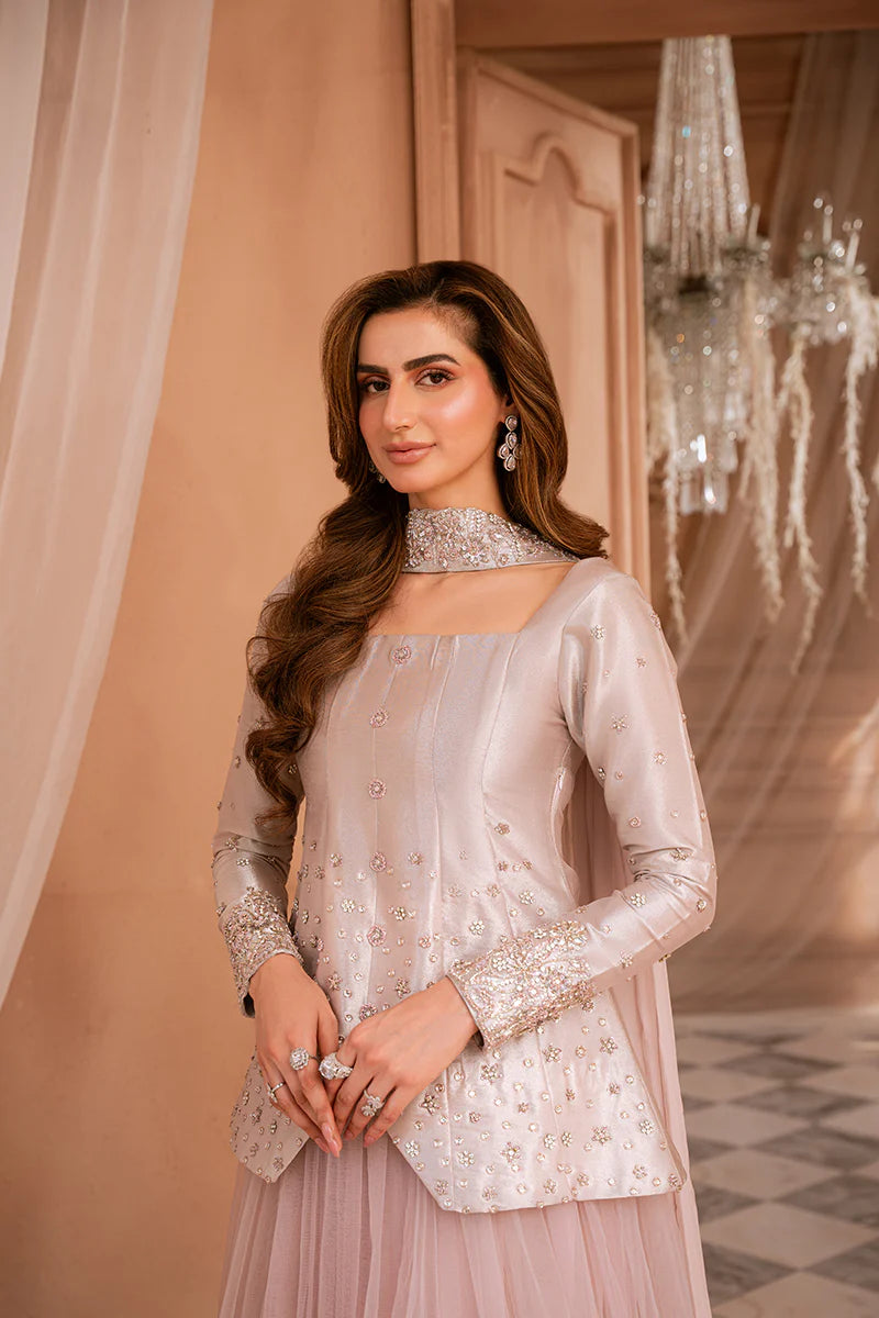 Named after the Carina constellation, home to one of the most radiant nebulae in the cosmos, this piece captures celestial charm through soft wisteria tones that evoke starlight—graceful, feminine, and timelessly elegant. Designed for the modern woman who effortlessly commands sophistication, the tissue-silk peplum showcases intricate naqshi and crystal embellishments adorning the cuffs, while a jewel-toned chiffon drape cascades from the neckline like liquid starlight, shimmering with every graceful movement. The piece transitions into an ombre net skirt that creates an enchanting, weightless silhouette perfect for special occasions and celebrations. The combination of tissue silk, delicate embroidery, and flowing chiffon ensures you'll feel both refined and radiant. Whether you're attending a wedding, festive gathering, or milestone event, this ensemble delivers the perfect balance of traditional artistry and contemporary allure. Fabric: Tissue silk peplum, chiffon drape, and net skirt.