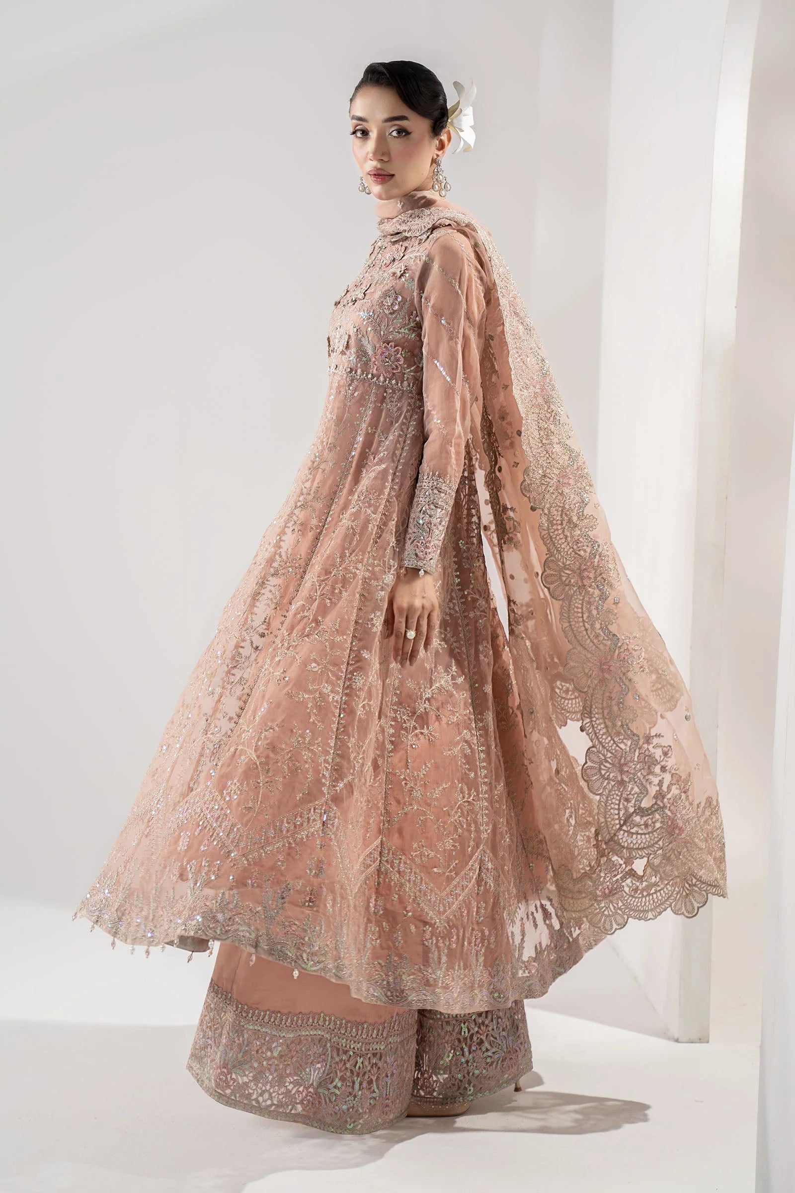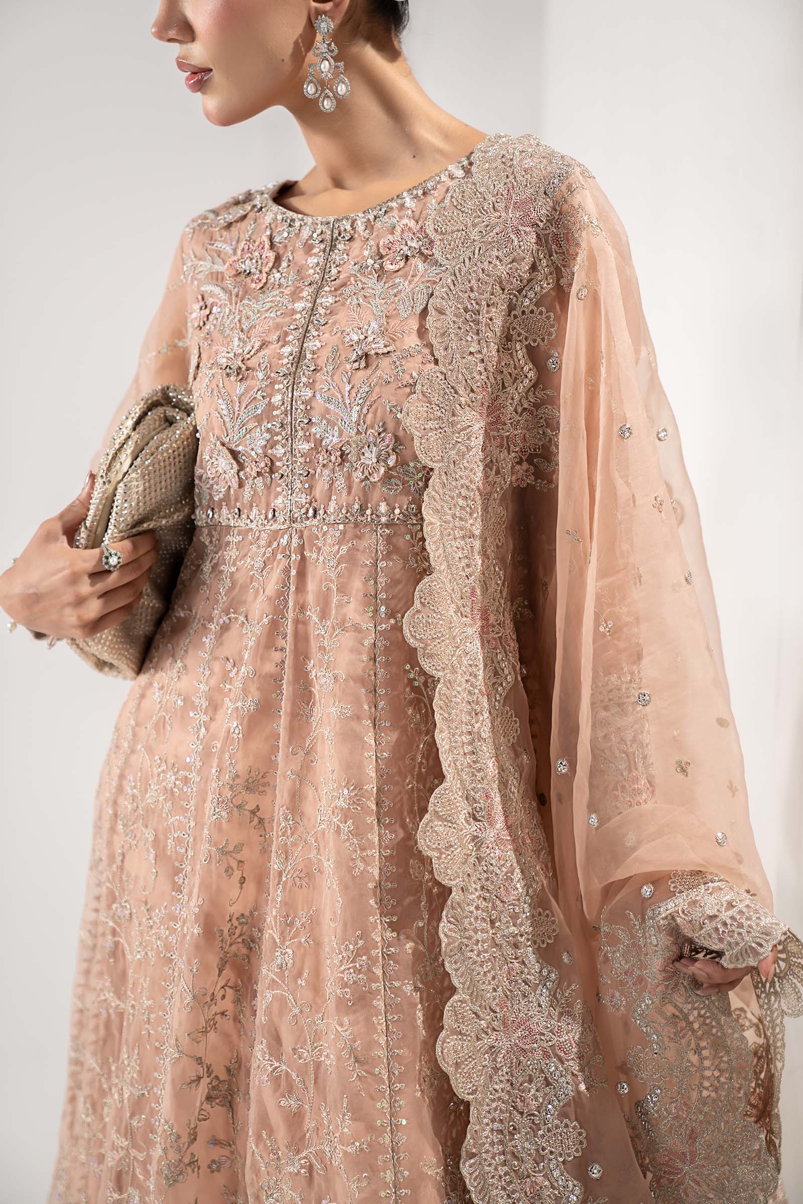 Elevate your wardrobe with this stunning Maria B lawn suit, a masterpiece of intricate craftsmanship. The frock features a graceful round neckline adorned with hand-embellished 3D floral details across the bodice, complemented by embroidered flare panels and fitted sleeves embellished with pearls and crystals. The coordinating peach organza dupatta showcases four-sided embroidery with a delicate scalloped border, while the cotton satin trouser offers comfort with an elasticated waistband and embroidered detailing. Crafted from premium organza and cotton satin fabrics, this ensemble combines traditional artistry with contemporary elegance. Perfect for weddings, celebrations, and special occasions. Dry clean only.