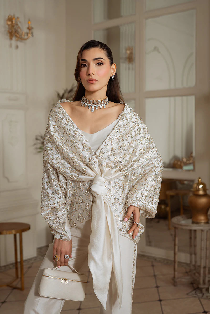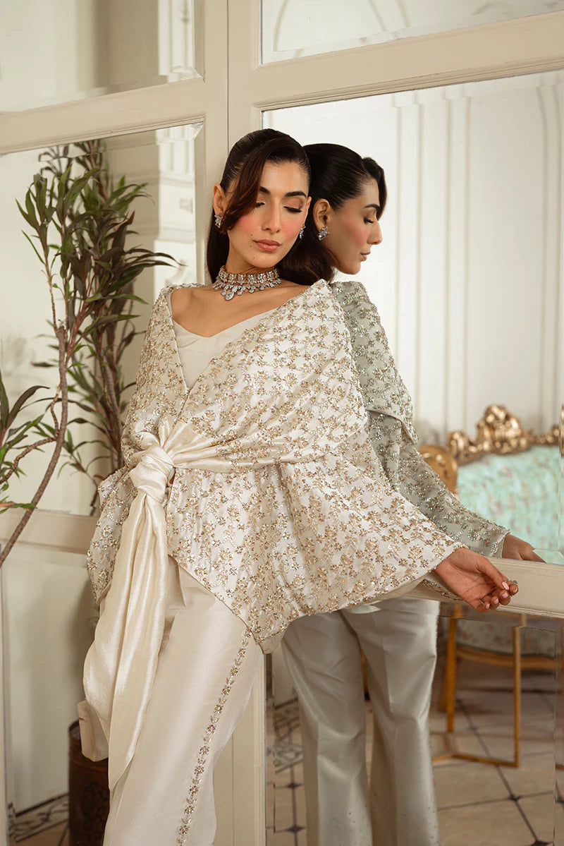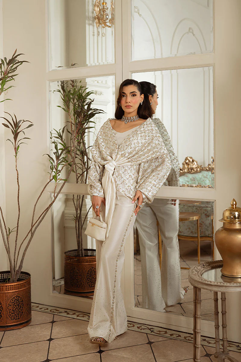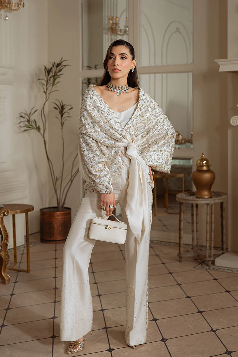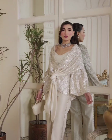 This wrap set draws inspiration from Princess Diana's iconic affinity for off-white, a color she often wore to exude purity, grace, and timeless elegance. Off-white, for Diana, symbolized both royal sophistication and a warm, approachable charm that transcended formality. Crafted from luxurious pure silk, this wrap-style outfit is hand-embellished with intricate zardozi and pearls, echoing her refined taste and attention to exquisite detail. The artisanal embellishments catch light beautifully, creating dimension and movement with every wear. Paired with panel-flared trousers adorned with delicate handwork, this ensemble offers a modern yet classy silhouette that flatters while commanding presence. Perfect for weddings, formal events, or any occasion where you want to make a sophisticated statement, this co-ord set celebrates the timeless allure Diana embodied. Whether you're attending a gala or hosting an intimate celebration, this piece allows you to channel her unforgettable elegance while expressing your own strength and grace. Invest in a look