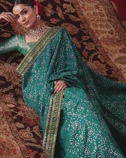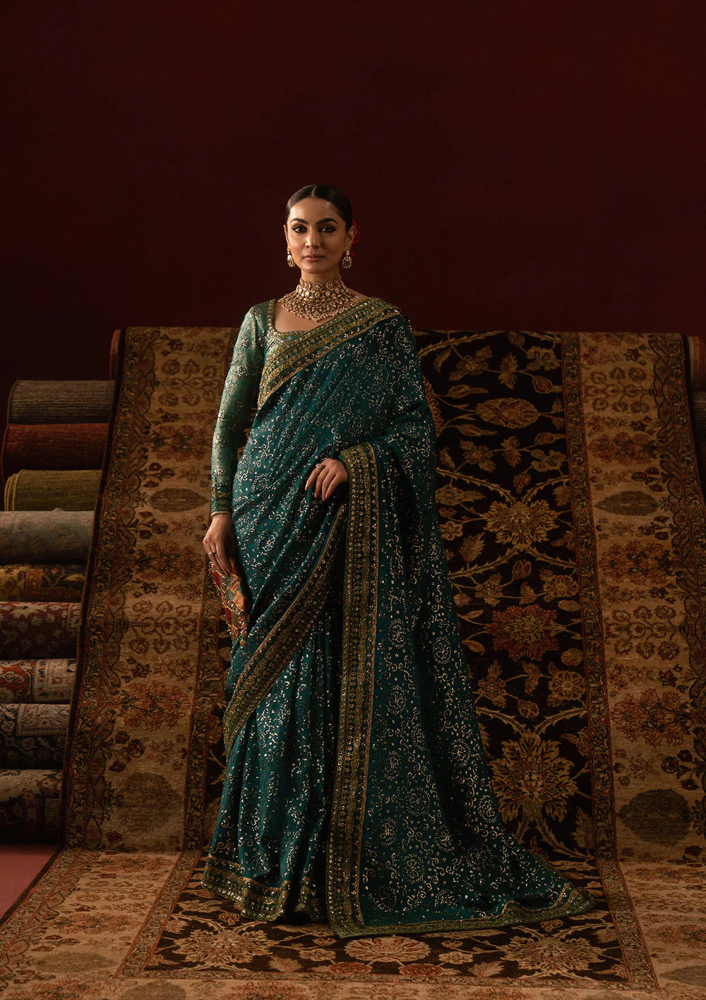 Elevate your wardrobe with the Sitaara Emerald Green Medium Silk Saree, a masterpiece of intricate craftsmanship. This stunning piece features exquisite embroidered Jamawar detailing on the front and back bodice, complemented by an ornate embroidered organza neckline. The saree showcases a beautifully embroidered pallu and border in organza, while the sleeves are adorned with matching Jamawar embroidery and delicate organza edging. Crafted from luxurious medium silk, this saree drapes elegantly and comes with a coordinating medium silk petticoat for a perfect fit. Ideal for celebrations and special occasions, this piece combines traditional artistry with timeless sophistication.